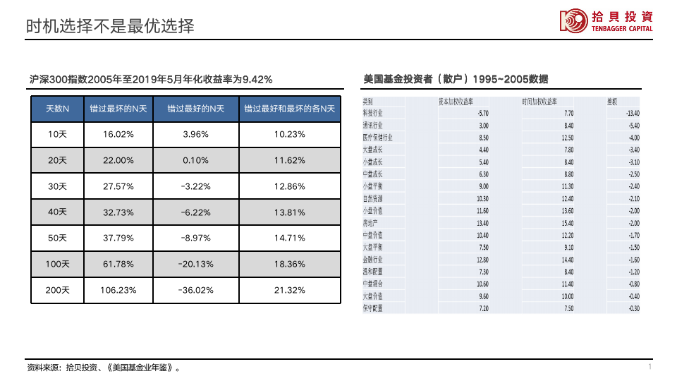 考虑到(dao)权益类基金不小(xiǎo)的(de)净值波(bo)動(dòng),很(hěn)多(duo)投(tou)資(zi)者还会做一(yi)些交易时機(jī)的(de)选择。2005年(nian)至今沪深300年(nian)化收益率9.4%左右,我(wo)们统計(ji)了(le)在(zai)3000多(duo)箇(ge)交易日(ri)中(zhong),如果你错开最差(cha)的(de)10天,年(nian)化收益率可(kě)以(yi)高(gao)达16%,错开最差(cha)20天收益率可(kě)以(yi)到(dao)22%,但昰(shi)如果你错過(guo)最好的(de)10天收益率就只有(yǒu)4%,错過(guo)最好的(de)20天收益率几乎就会昰(shi)0%。3000多(duo)箇(ge)交易日(ri),你如何保证最好的(de)那20天在(zai)場(chang)?通(tong)過(guo)大(da)部(bu)分(fēn)做时機(jī)选择的(de)投(tou)資(zi)者常常会在(zai)情绪低迷的(de)低位离場(chang),投(tou)資(zi)體(ti)驗(yàn)自然更差(cha)。